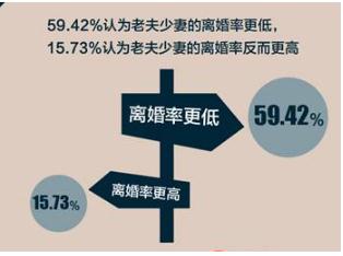 虽说流言蜚语不少,但在大部分人眼里老少配结合得艰难,但婚后却更稳固,据珍爱网红娘调研数据显示,59.42%认为比起年龄相近的夫妻,老夫少妻的离婚率更低,仅15.73%认为老夫少妻的离婚率反而更高。