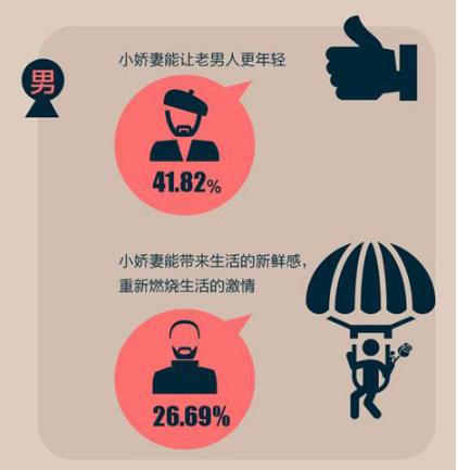 数据显示,五成以上女性不爱物质,只爱成熟男人的生活智慧与能力,但同时也有四成女性认为老男人能带来富足物质与捷径。而从老男人的角度来看,41.82%男性认为他们在老夫少妻的模式中最看重小娇妻能让老男人更年轻,26.69%认为小娇妻能带来生活的新鲜感,重新燃烧生活的激情。